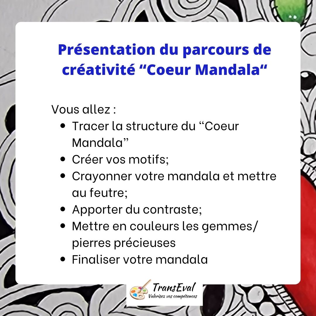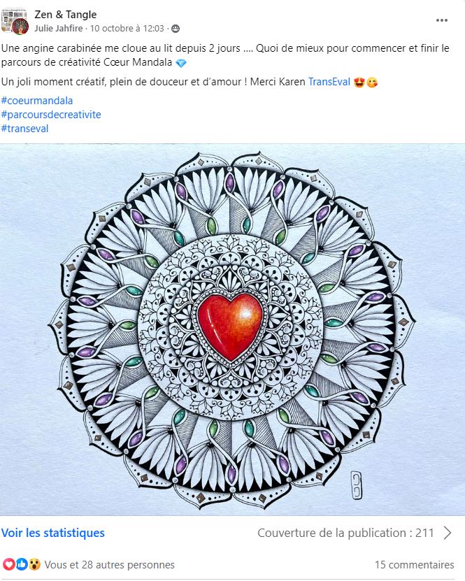 “Quel joli parcours de créativité que le Cœur Mandala ! Un moment de magie, de détente et d’amour. La rigidité du mandala peut faire peur au premier abord … mais Karen a une méthode plus souple, qui nous permet de se laisser aller tout en créant une super œuvre structurée ! Elle nous invite à créer / arranger les tangles qui symbolise pour nous l’amour, et les gemmes viennent illuminer l’ensemble. Merci Karen pour ce super parcours”! Julie Jahfire
